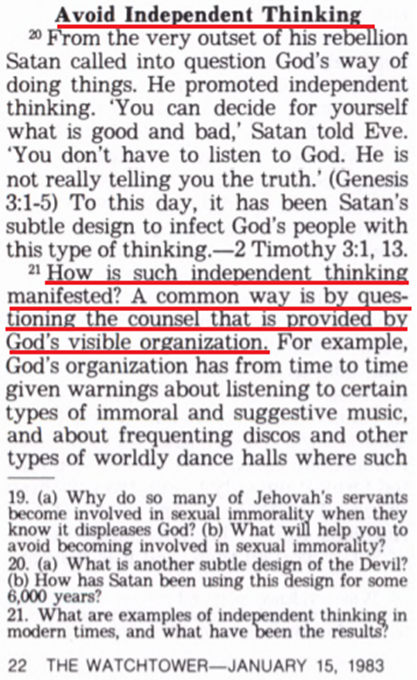 Will the typical JW find this out? Not likely! Remember: “Avoid Independent Thinking . . questioning the counsel that is provided by God’s visible organization.” The Watchtower, January 15, 1983, p. 22.